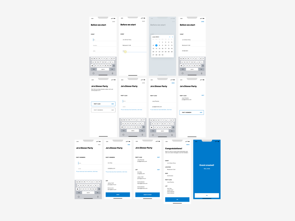 Trying to figure it all the paths that were needed to conclude the flow from creating the event, using the device's default calendar, adding the guest with their emails so they could be notified, give the freedom for the used to edit all along the way and a success page to confirm the complete task.